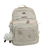 Beige kawaii backpack with cute bear pins, plush cloud charm, and multiple pockets, size 15x11.5x5 inches