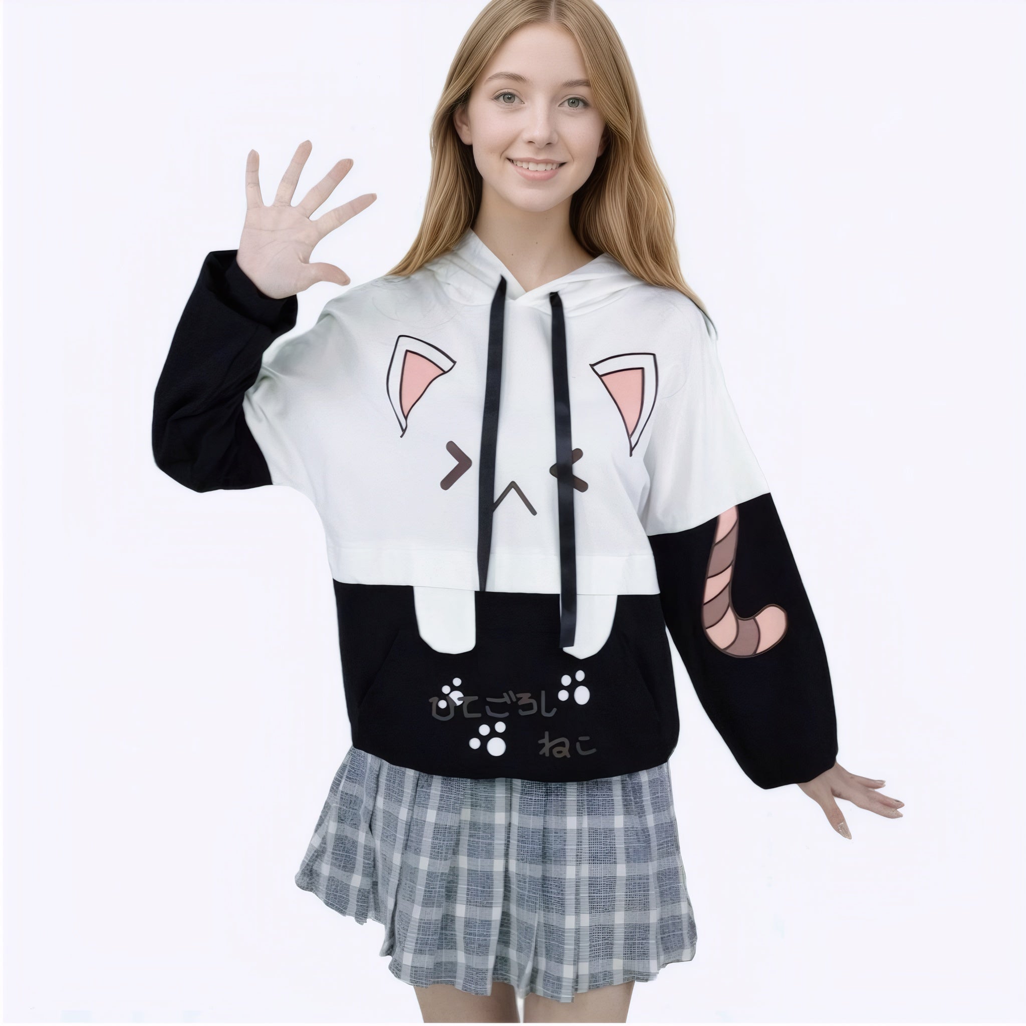 Kawaii Cat Ears Hoodie for Girls Japanese Cartoon Pullover with Paw & Tail Print
