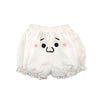 White ruffled bloomer-style shorts with cute cartoon face print and elastic waist, soft cotton fabric.