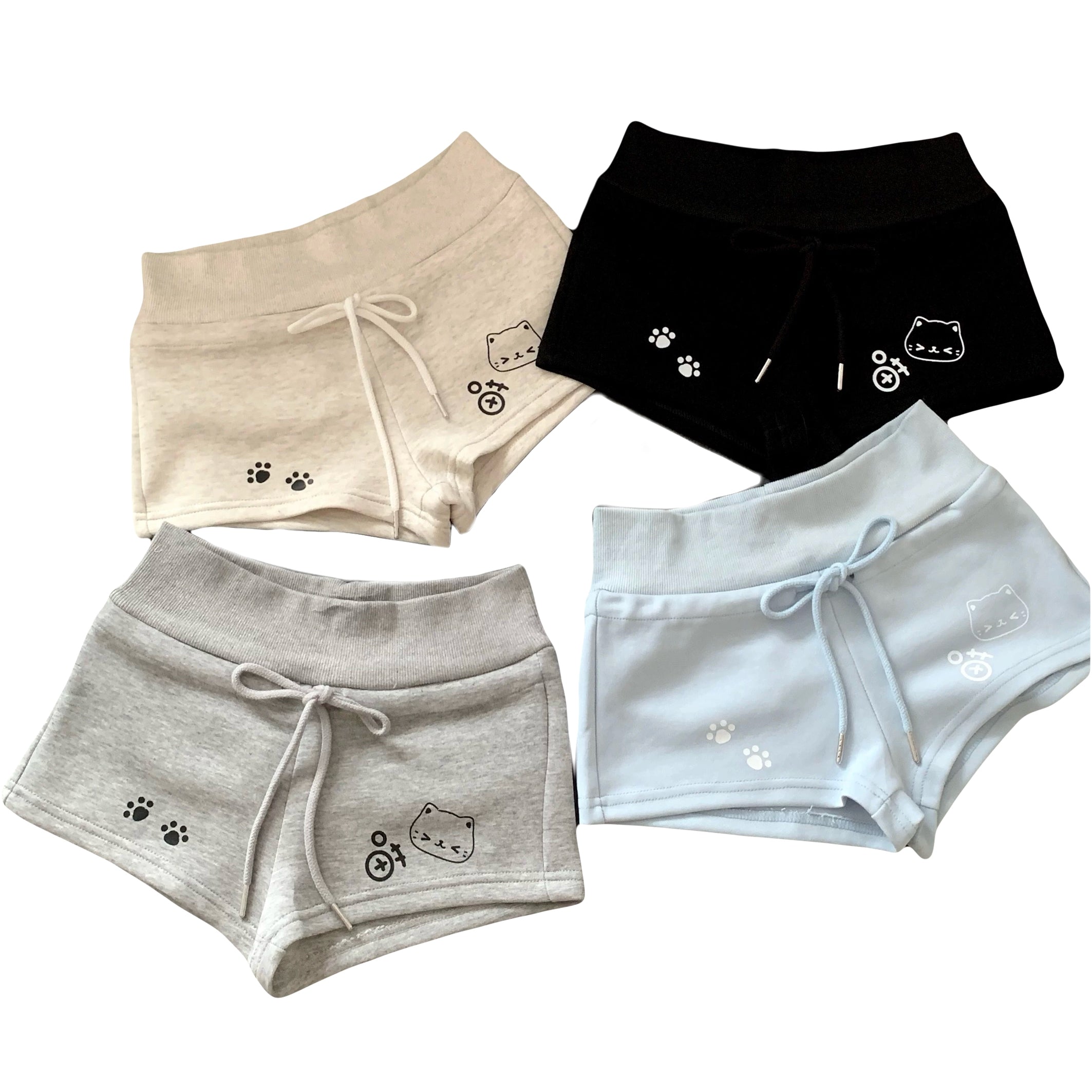 High waist cotton shorts with cute cat face and paw prints, drawstring waistband in four pastel colors